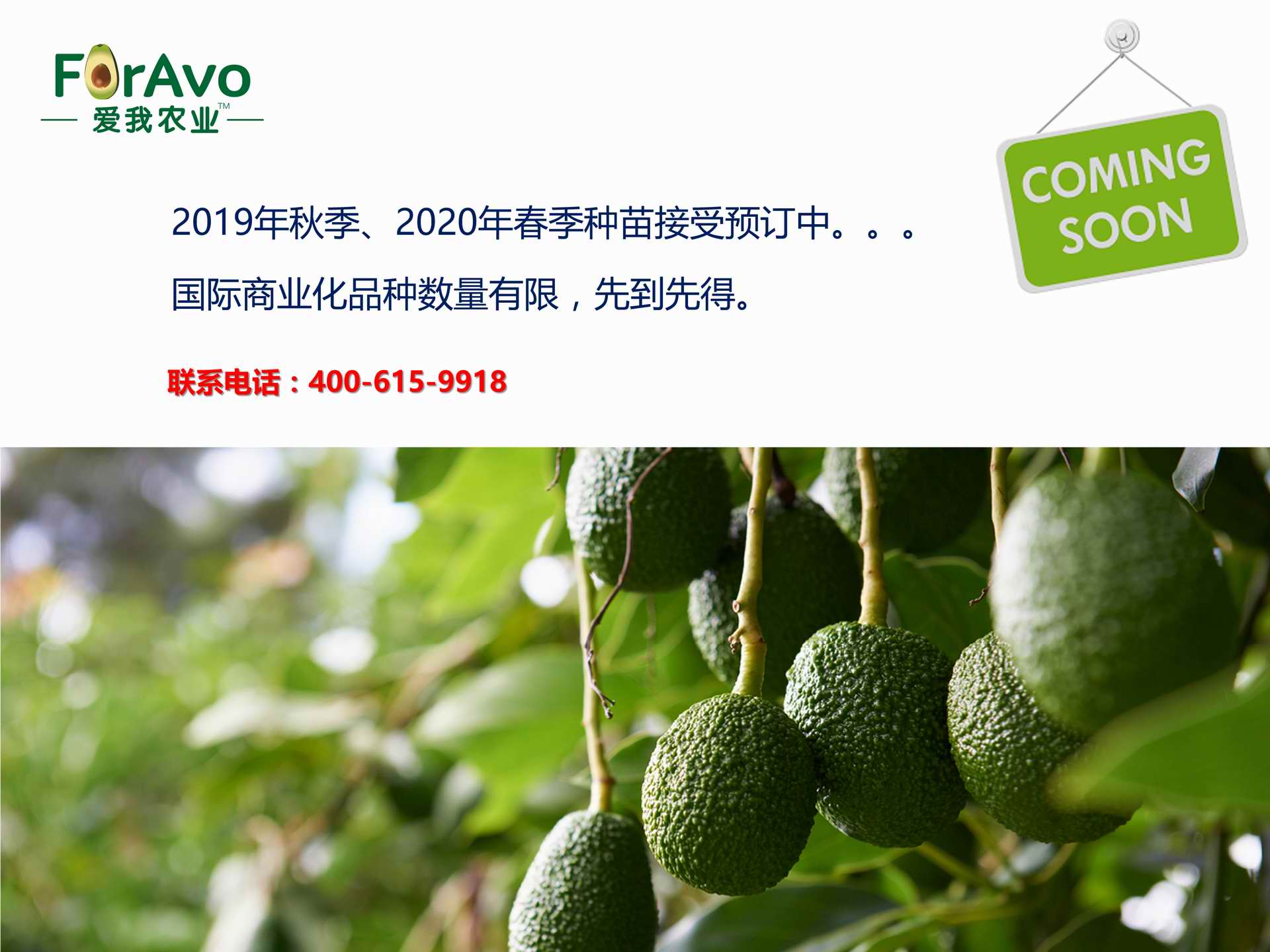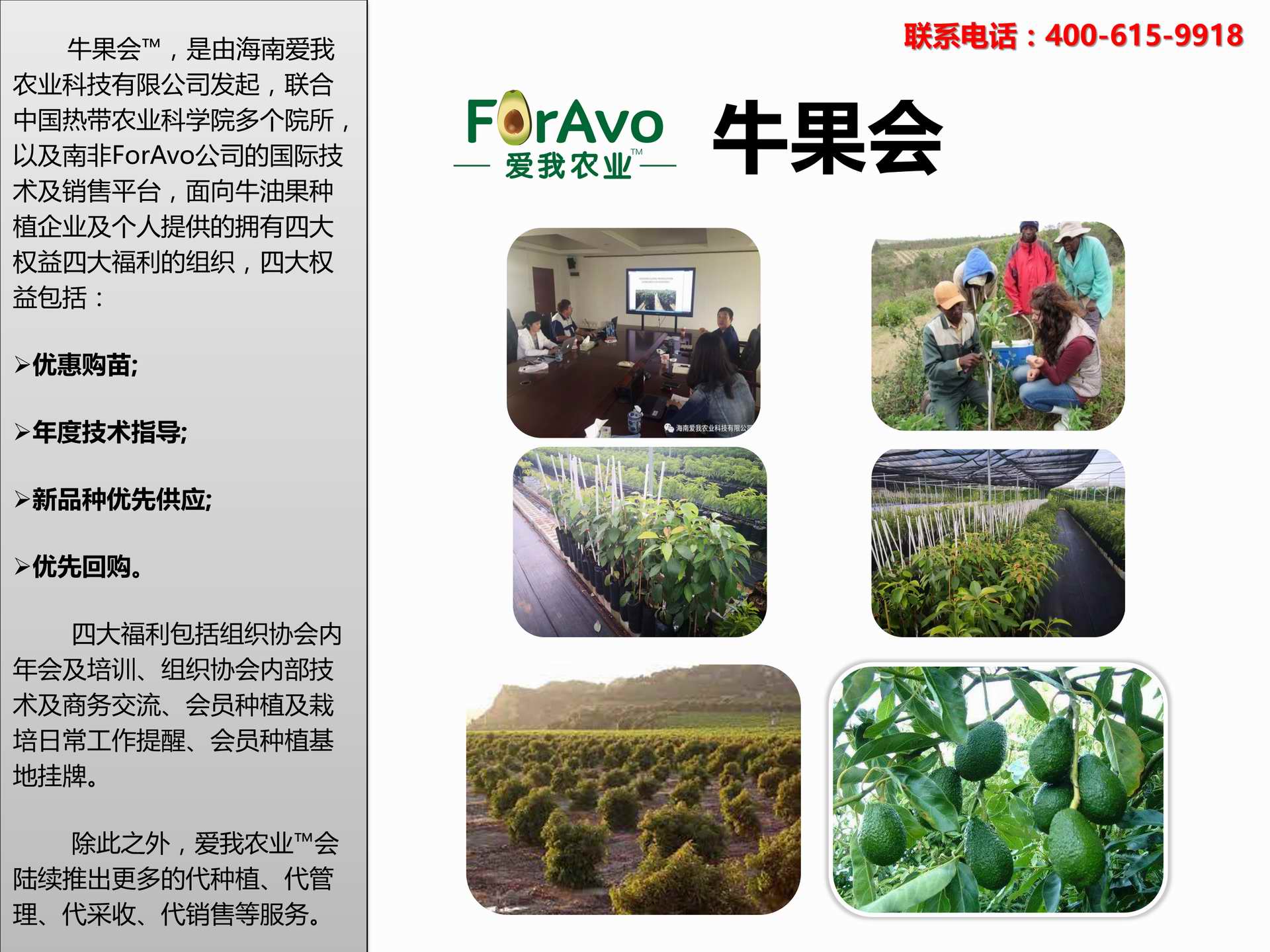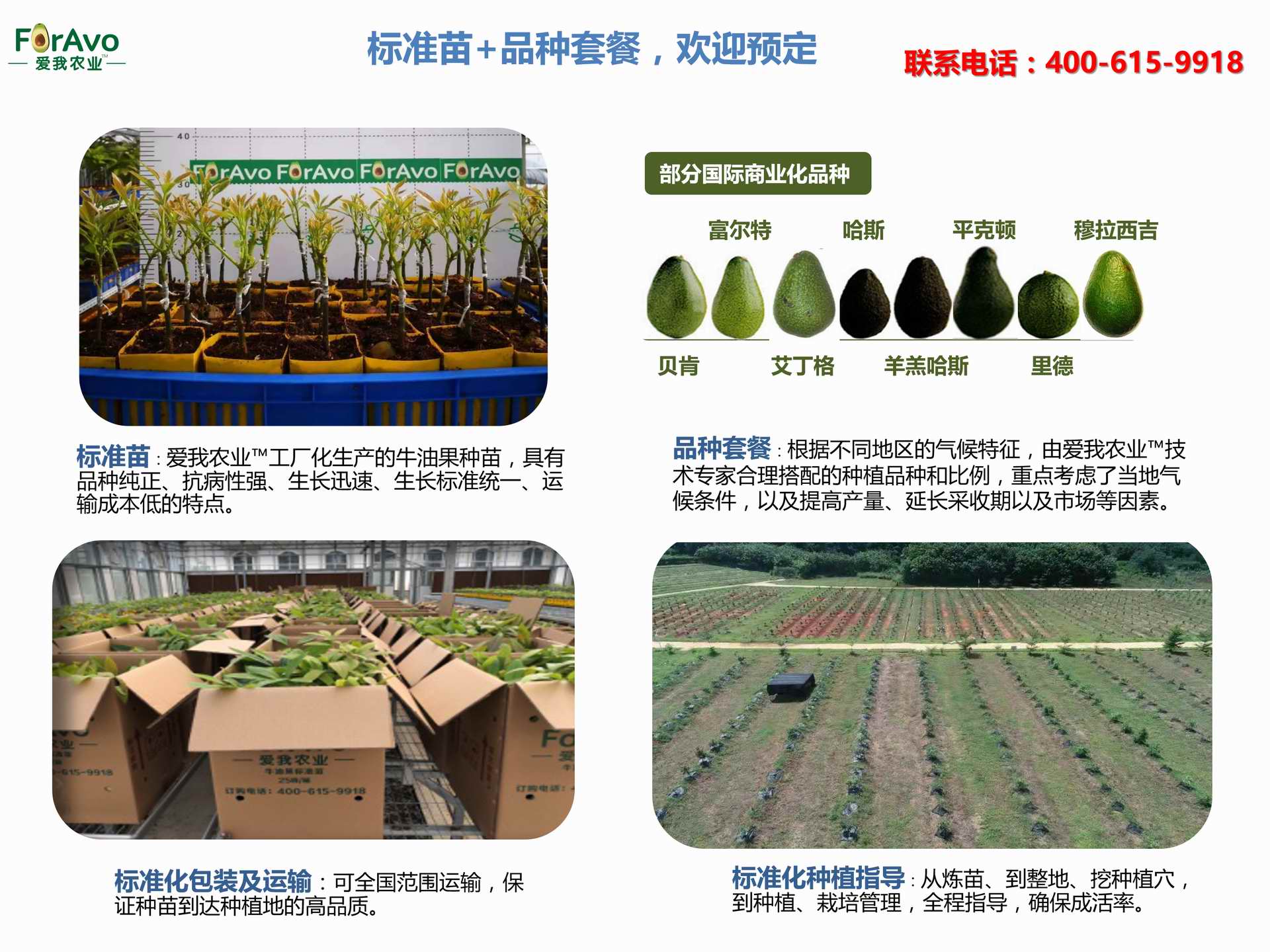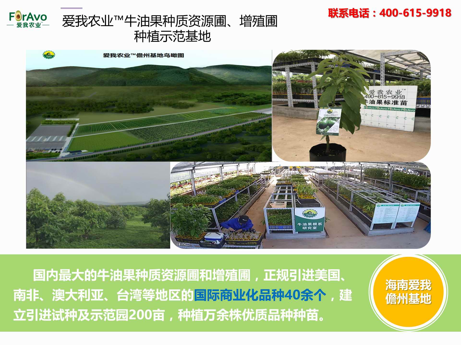 海南愛我農(nóng)業(yè)科技有限公司是一家綜合性的高科技農(nóng)業(yè)發(fā)展企業(yè),旗下愛我農(nóng)業(yè)TM致力于打造中國最大最強(qiáng)的牛油果種植企業(yè)。依托美國、南非、澳大利亞等擁有百年牛油果繁育、種植歷史以及產(chǎn)業(yè)鏈?zhǔn)袌?chǎng)的優(yōu)勢(shì),開展牛油果種苗繁育、種植技術(shù),種植加盟、深加工等產(chǎn)業(yè)。結(jié)合中國市場(chǎng),面向廣大苗圃基地、種植農(nóng)場(chǎng)、合作加工等企業(yè),推出的適合規(guī)模化、標(biāo)準(zhǔn)化的牛油果全產(chǎn)業(yè)鏈服務(wù)。 Hainan Foravo Agricultural Technology Co., Ltd. is a comprehensive high-tech agricultural development enterprise , dedicated to building the largest and most powerful avocado plantation enterprise in China. Relying on the advantage of avocado nursery, planting history, and the industrial chain over 100 years in the United States, South Africa, Australia, we are carrying out nursery, planting, proce...